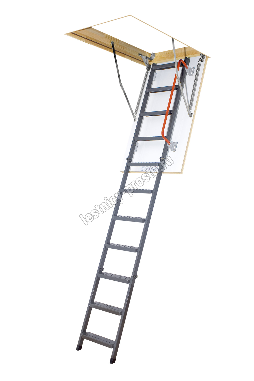 Чердачная металлическая лестница LMK – это надежная складная конструкция, состоящая из марша и термоизоляционной крышки, изготовленной из ДВП и окрашенной в белый цвет.