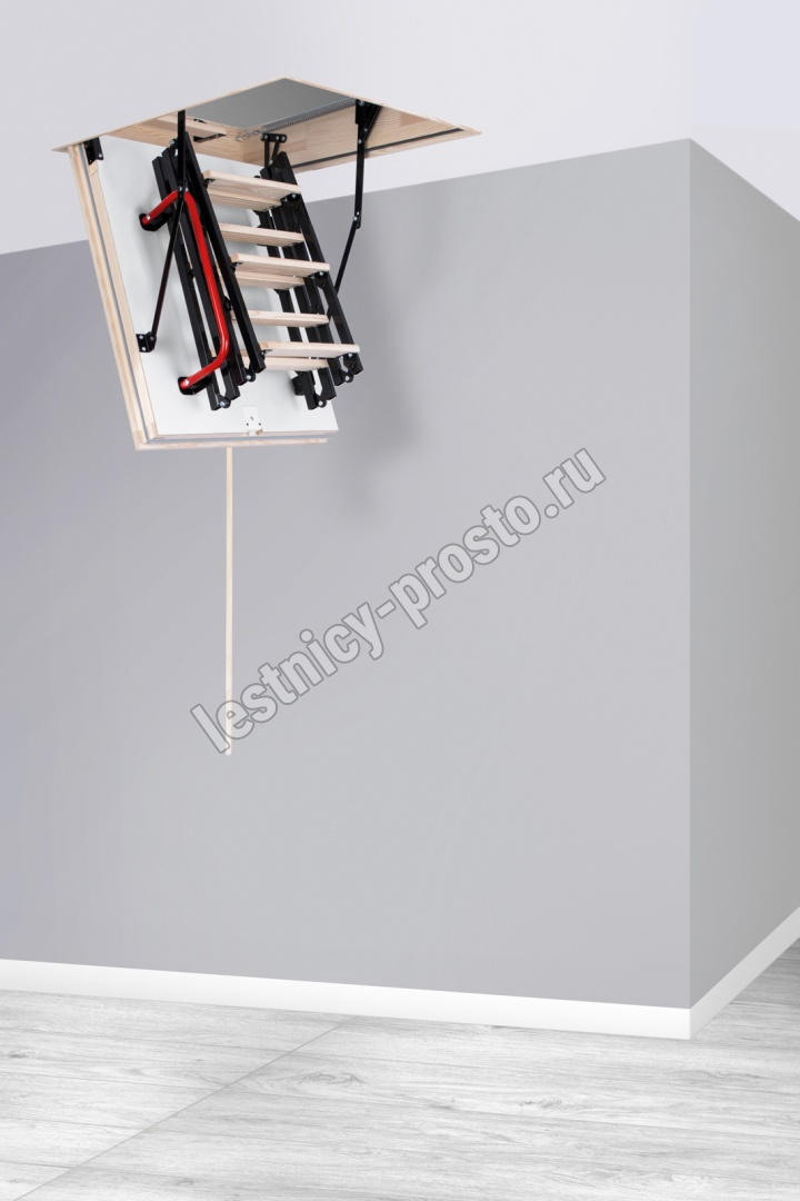 Складная 4-х секционная чердачная лестница. Ступени выполнены из сосны, имеют противоскользящие насечки, направляющие из металла