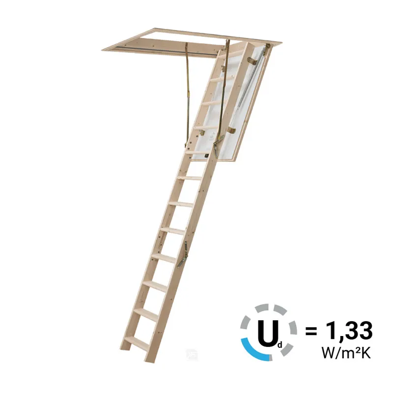 В комплекте: люк из сэндвич-панели, пружинный механизм "короб-люк", короб, трехсекционная лестница с сосновыми ступенями, замок люка, штанга для раскладывания лестницы.