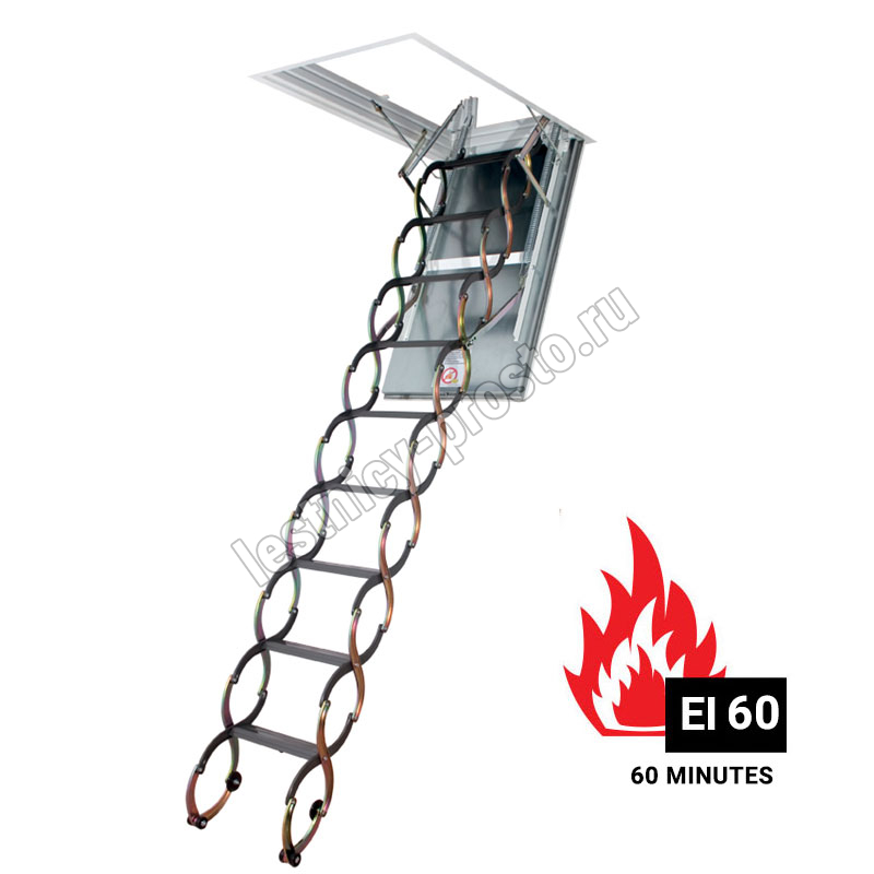 Модель обладает высокими показателями огнестойкости (60 мин.) По периметру крышки люка, изготовленного из огнеупорного несгораемого материала, установлен контур уплотнения, который, расширяясь под влиянием высокой температуры, ограничивает проникновение дыма. Все материалы, используемые при производстве лестницы, прошли испытания на огнестойкость и соответствуют всем европейским нормам и имеют необходимые российские пожарные сертификаты соответствия.