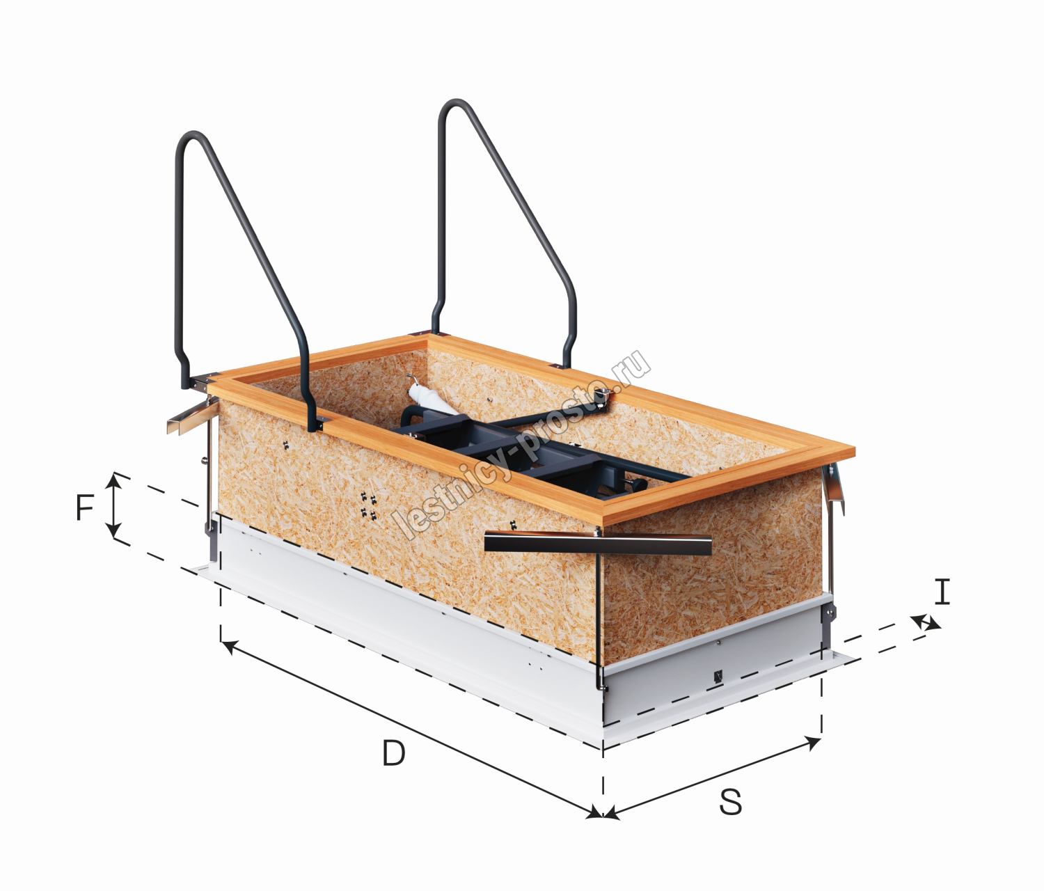 Лестница чердачная складная металлическая 3-х секционная. Ступени полностью выполнены из металла и покрашены порошковой краской. Лестница имеет 2 короба и 2 крышки люка. Нижняя крышка лестницы представляет собой многослойную конструкцию – деревянная рама, внутри которой находится теплоизоляция и противопожарная вставка. Внутренняя часть крышки покрыта оцинкованной жестью, наружная часть белой эмалью и защитной пленкой. Толщина крышки 60мм. Верхний люк выполнен из влагостойкой фанеры и обработан антигрибковым средством. Короб металлический высотой 140мм по периметру проходит уплотнитель. Все соединяющие части изготовлены из твердого материала и имеют оцинкованное покрытие.