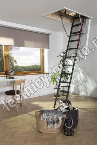 Лестница представляет собой складную конструкцию из металлического лестничного марша и термоизоляционного люка.
