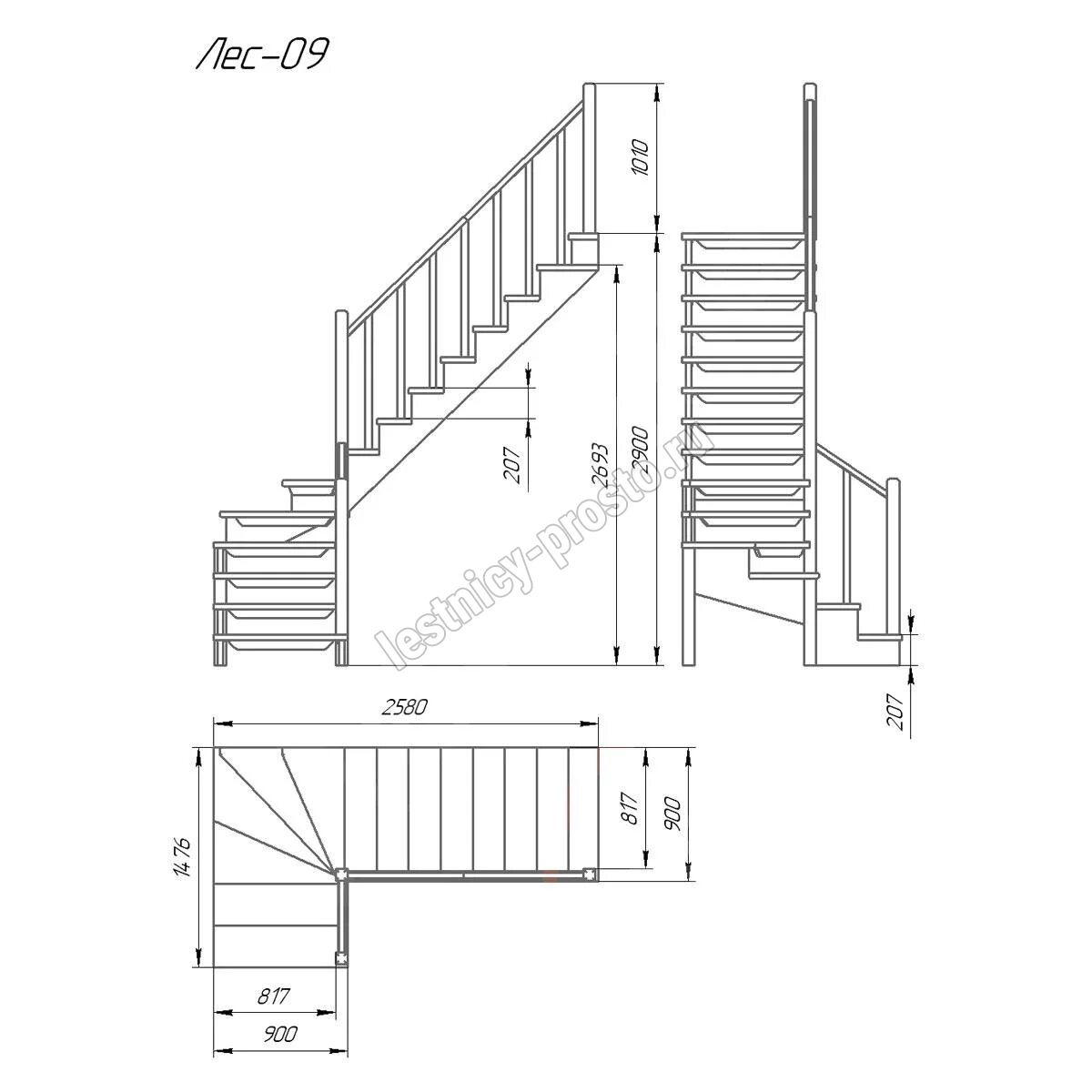 Деревянная межэтажная лестница ЛЕС-09 2900 проем 2580-900, Сосна