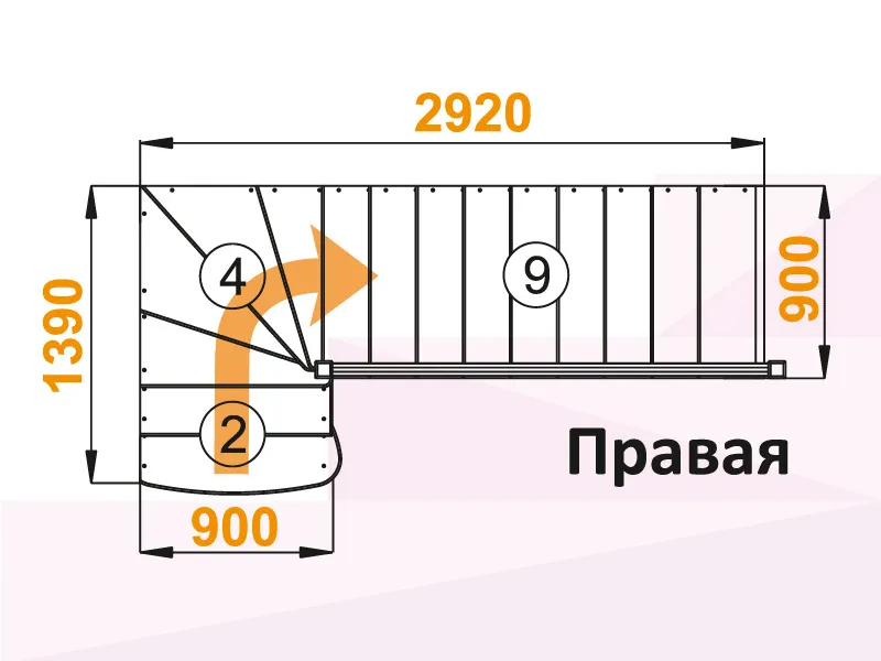 Поворот лестницы на 90 градусов выполнен через 4 забежные ступени. Первая (снизу) ступень - пригласительная, имеет скругленные внешние углы.