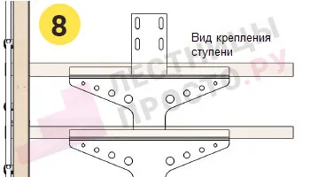 При заказе вы можете выбрать любой вид крепления ступеней из показанных ниже в блоке "Чертежи и схемы" (просто оформите заказ, мы позвоним вам для согласования заказа и спросим номер необходимого крепления) .