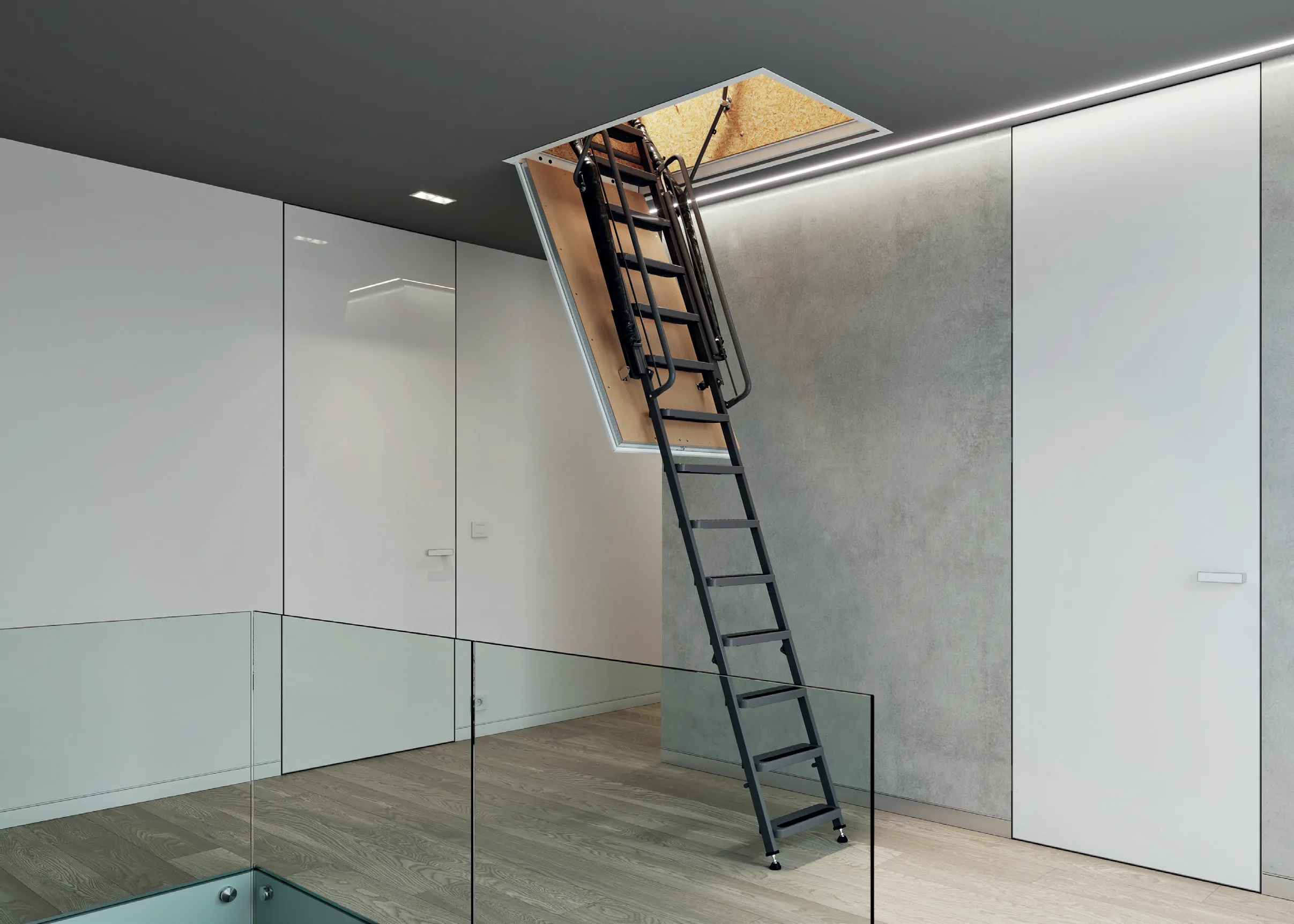 Kloè создается путем сочетания цветов стали, черного (RAL 9017), белого (RAL 9010) или серого (RAL 9006) со светлыми (натуральными) или темными тонированными ступенями из бука.