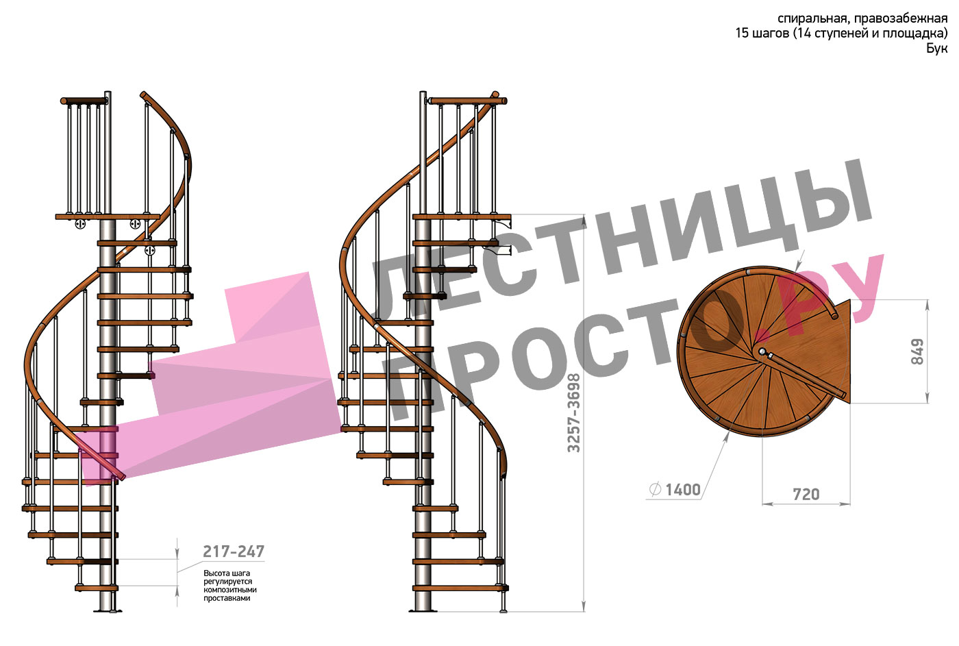 Правая, d=140см, 14 ступеней + площадка
