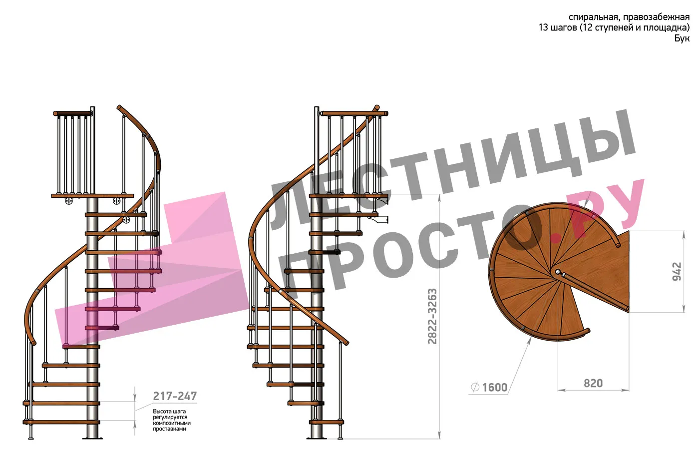 Правая, d=160см, 13 ступеней + площадка