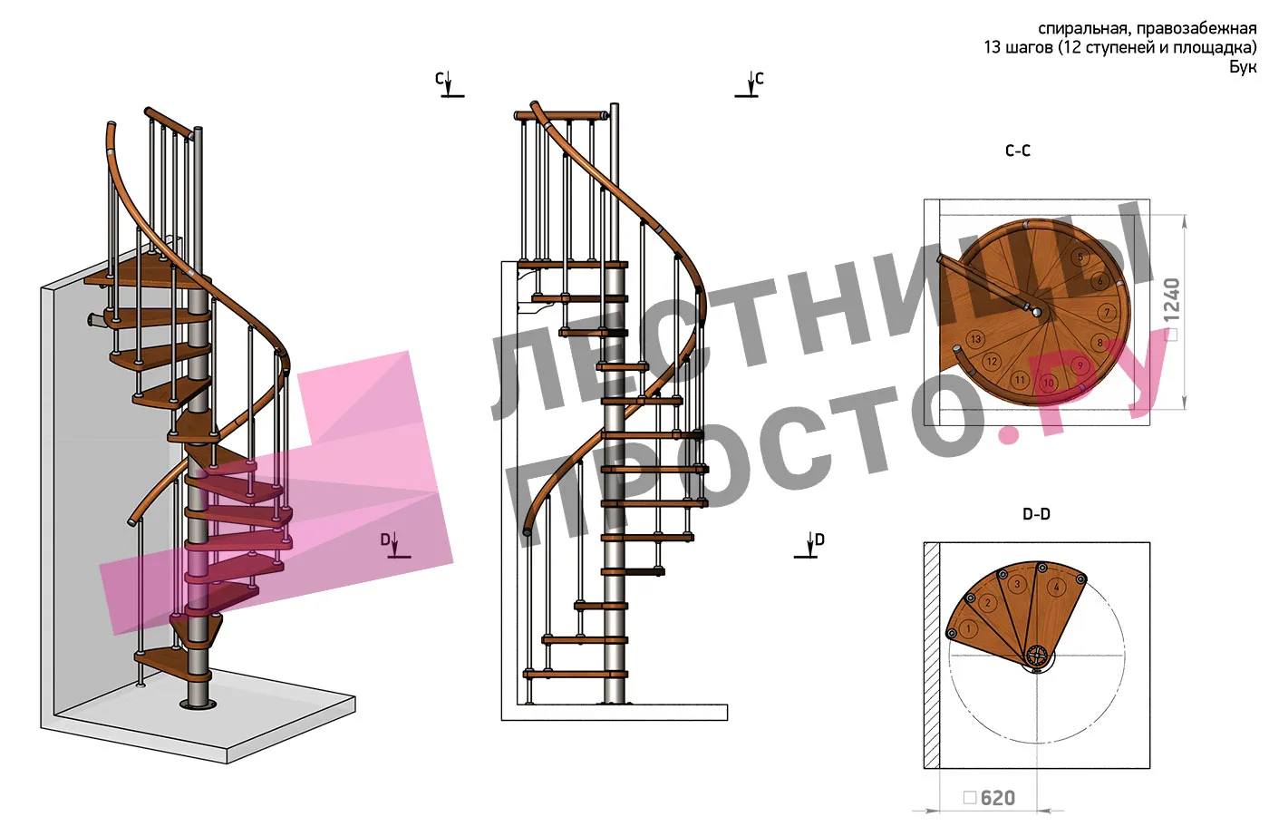 Правая, d=120см, 14 ступеней + площадка