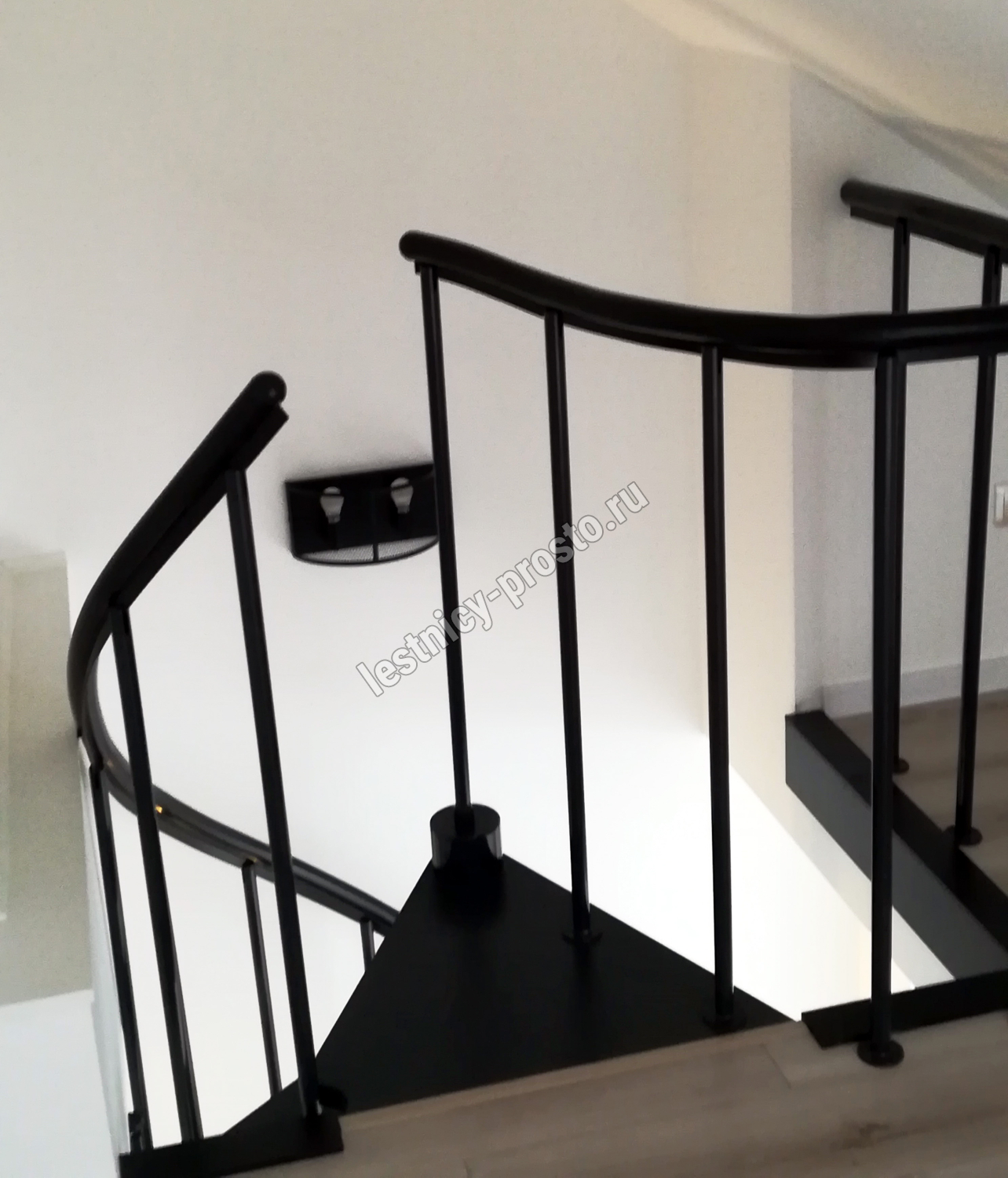 Ступени лестницы изготовлены из бука по технологии MULTIPLEX и покрыты износостойким защитным лаком. Лестница монтируется как по часовой стрелке, так и против. Возможен монтаж в круглый или квадратный проём. Ограждение: стальные трубки, Ø25 мм RAL 7016. Поручень: гибкий цельный ПВХ-поручень Ø40 мм антрацитового цвета. Конструкция и балюстрада окрашены порошковым способом в антрацитовый цвет (RAL 7016).